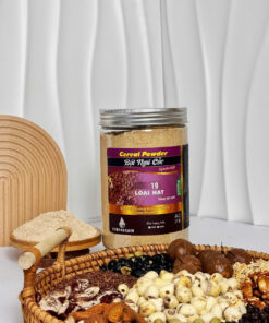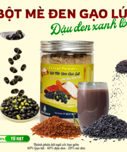 - Mè đen (20%): Hạt mè đen rang chín, xay mịn, giàu canxi, sắt, vitamin E, chất béo lành mạnh và các chất chống oxy hóa, có tác dụng bổ máu, đẹp da, đen tóc và tăng cường sức khỏe xương khớp.
